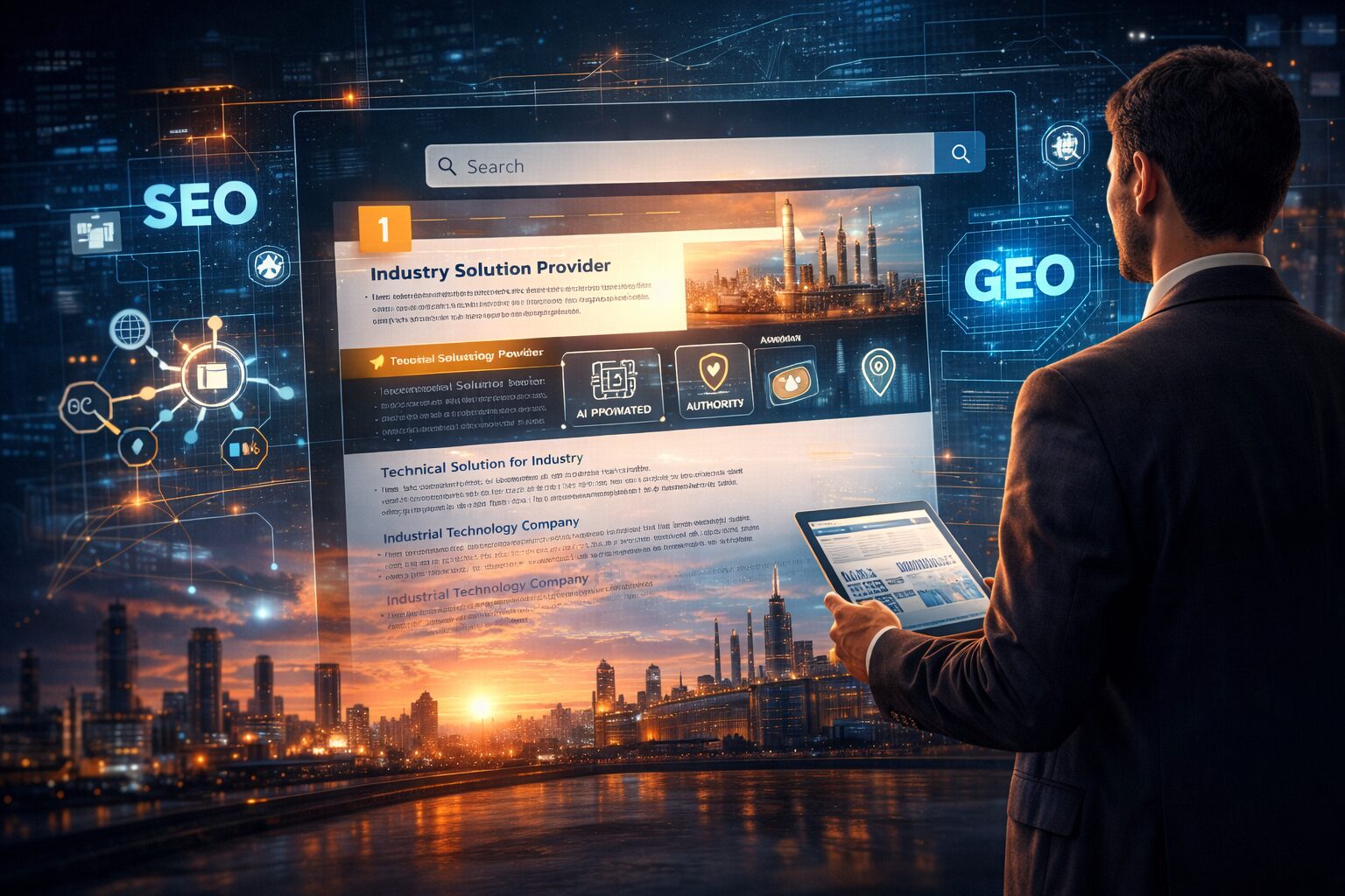 Embora o Account-Based Marketing seja direcionado, a presença digital através de SEO e GEO (Generative Engine Optimization) sustenta sua credibilidade. Quando um decisor de uma conta-alvo pesquisa por uma solução técnica, sua marca deve aparecer como autoridade máxima nos buscadores modernos.
