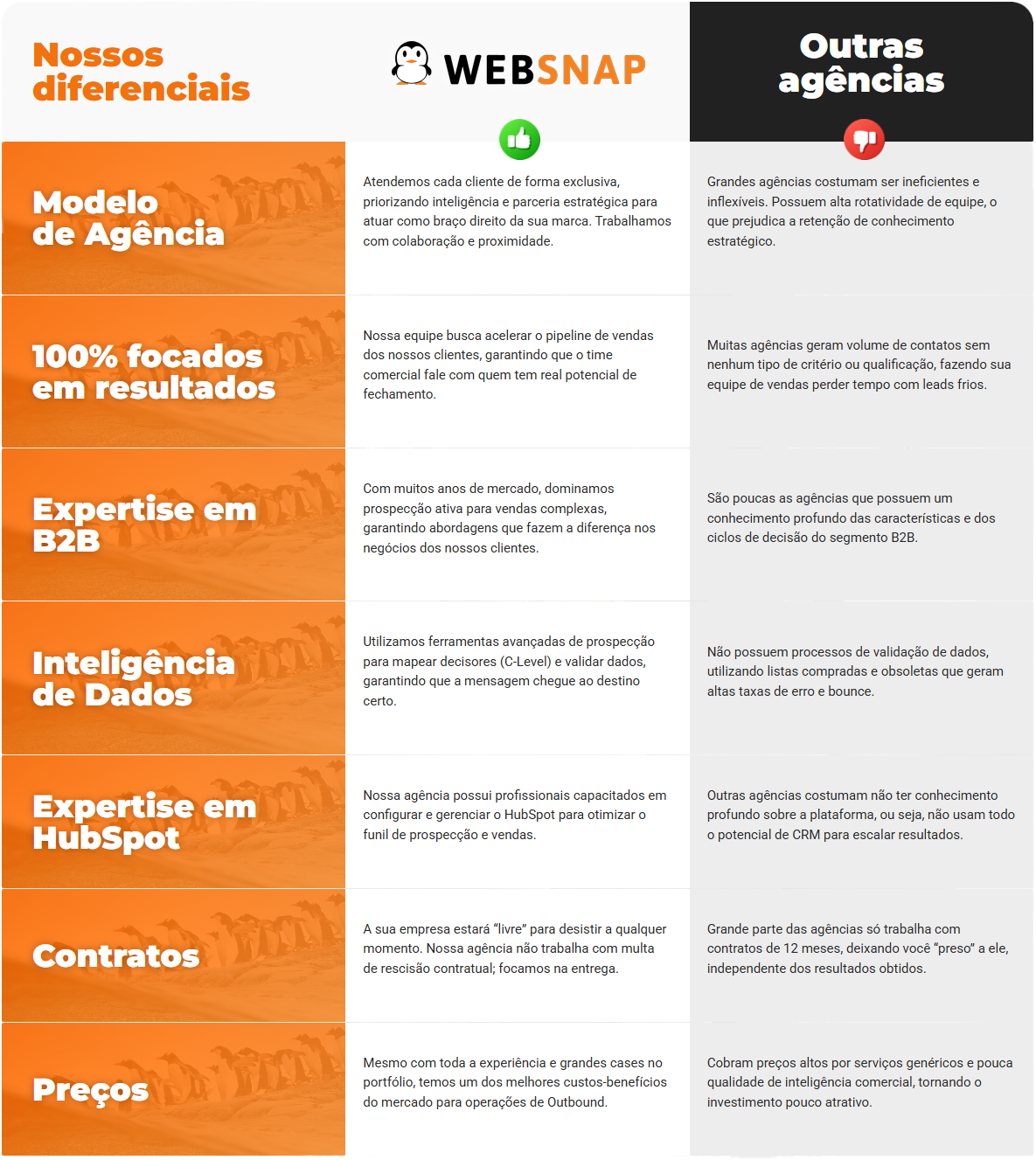 No Inbound, criamos conteúdo para que o cliente encontre a empresa (atração). No Outbound, a WebSnap identifica as empresas com perfil ideal e inicia o contato direto (prospecção ativa). O Outbound é focado em velocidade e em alcançar contas específicas que podem não estar buscando sua solução ativamente.